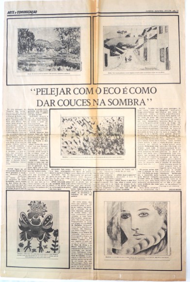 Coleção Coleção Instituto Meyer Filho Item MF.02213 14/10/2022 por Ana Julia Patricio   Documento MF.02213 Baixar Metadados Miniatura Nº de registroMF.02213Localização no InstitutoMAPOTECA 1 - GAV. 8 - PASTA 13ColeçãoIII. PeriódicosTipoJornalTítuloFolha de Londrina (PR) 1978AutoriaNILocal*Londrina (PR)Data Década 1970 Ano 1978 DescriçãoPágina 13 do jornal de 27/01/1978 com matéria intitulada: "Pelejar com o eco é como dar couces na sombra".IndexadoresFolha de Londrina | Jornal | Porto AlegreDimensão38,9 x 57,4SuportePapel jornalTécnicaImpressão sobre papel jornalBordaNão se aplicaColorNão se aplicaEstado de conservaçãoBomDanos causados porAmarelecimento | Manchas | Sujidades | Vincos e dobrasProcedimentosAcondicionado | Digitalizado | Higienizado | Realizar conservação curativaForma de aquisiçãoLicença de uso de direitos autorais gratuitaProcedência*Família Meyer FilhoRegistrado porAna Julia Vieira PatrícioData de registro14/10/2022Condições de ReproduçãoTodos os direitos reservados. Para utilização da imagem solicitar autorização ao Instituto Meyer Filho. Continue navegando MF.02244 MF.02289 Voltar para a página de itens