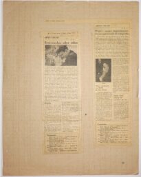 MF.02222.6 Recorte de jornal de 16/07/1960, aderido a uma folha pautada, aderida a outra folha sulfite com destaque para coluna “Artes Visuais” com matéria intitulada “Exposições”. (24,8 x 9,7 cm)