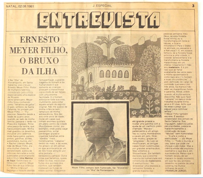 Recorte de jornal, aderido a uma folha sulfite, de 02/08/1981 com entrevista de Franklin Jorge com Meyer Filho intitulada: "Ernesto Meyer Filho, O Bruxo da Ilha." Apresenta imagem do artista e de uma de suas obras. Possui fotocópia reduzida MF.02227.1 (21,5 x 32,8 cm)