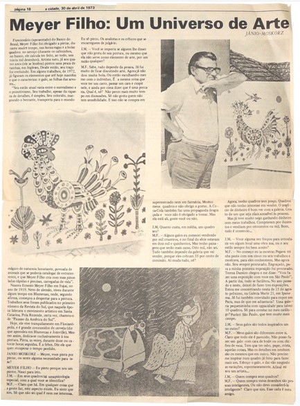 Coleção Coleção Instituto Meyer Filho Item MF.02253 01/11/2022 por Ana Julia Patricio   Documento MF.02253 Baixar Metadados Miniatura Nº de registroMF.02253Outros registros Outros registros NI Outros registros NI Localização no InstitutoMAPOTECA 1 - GAV. 8 - PASTA 14ColeçãoIII. PeriódicosTipoJornalTítuloA cidade (SC) 1973AutoriaNILocal*Florianópolis (SC)Data Data 30/04/1973 Década 1970 Ano 1973 DescriçãoPágina de jornal de 30/04/1973 com destaque para matéria e entrevista de Jânio Moskorz intitulada "Meyer Filho: Um universo de Arte" com reprodução de obra e fotografia do artista.IndexadoresA Cidade | Entrevista | Jânio Moskorz | JornalDimensão28,8 x 38,5 cmSuportePapel jornalTécnicaImpressão sobre papel jornalBordaNão se aplicaColorNão se aplicaEstado de conservaçãoBomDanos causados porAmarelecimento | Manchas | Sujidades | Vincos e dobrasProcedimentosAcondicionado | Digitalizado | Higienizado | Realizar conservação curativaForma de aquisiçãoLicença de uso de direitos autorais gratuitaProcedência*Família Meyer FilhoData de aquisição Data NI Registrado porAna Julia Vieira PatrícioData de registro01/11/2022Condições de ReproduçãoTodos os direitos reservados. Para utilização da imagem solicitar autorização ao Instituto Meyer Filho. Continue navegando MF.02254 MF.02295 Voltar para a página de itens