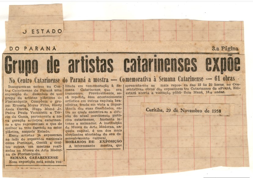 Coleção Coleção Instituto Meyer Filho Item MF.02293 11/11/2022 por Ana Julia Patricio   Documento MF.02293 Baixar Metadados Miniatura Nº de registroMF.02293Localização no InstitutoMAPOTECA 1 - GAV. 8 - PASTA 14ColeçãoIII. PeriódicosTipoJornalTítuloO Estado do Paraná (PR) 1958AutoriaNILocal*Curitiba (PR)Data Data 29/11/1958 Década 1950 Ano 1958 DescriçãoRecorte de jornal, aderido a uma folha pautada, aderido a outro folha sulfite, de 29/11/1958 com destaque para matéria da 3ª página intitulada "Grupo de artista catarinenses expõe".IndexadoresJornal | O Estado do ParanáDimensão19,9 x 15,2 cmSuportePapel jornalTécnicaImpressão sobre papel jornalBordaNão se aplicaColorNão se aplicaEstado de conservaçãoBomDanos causados porAmarelecimento | Manchas | Sujidades | Vincos e dobrasProcedimentosAcondicionado | Digitalizado | HigienizadoForma de aquisiçãoLicença de uso de direitos autorais gratuitaProcedência*Família Meyer FilhoData de aquisição Data NI Registrado porAna Julia Vieira PatrícioData de registro10/11/2022Condições de ReproduçãoTodos os direitos reservados. Para utilização da imagem solicitar autorização ao Instituto Meyer Filho. Continue navegando MF.02274 MF.02300 Voltar para a página de itens