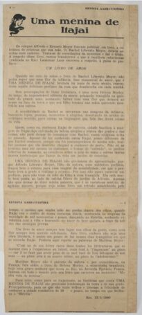 Coleção Coleção Instituto Meyer Filho Item MF.02295 09/11/2022 por Ana Julia Patricio   Documento MF.02295.2 Baixar Metadados Miniatura Nº de registroMF.02295Localização no InstitutoMAPOTECA 1 - GAV. 8 - PASTA 11ColeçãoIII. PeriódicosTipoRevistaTítuloRevista AABB (PR) 1960AutoriaNILocal*Curitiba (PR)Data Data 13/05/1960 Década 1960 DescriçãoRecorte de jornal, aderido a uma pautada, de 13/05/1960 com destaque para matéria intitulada "Uma menina de Itajaí", falando sobre a publicação das crônicas de Rachel Liberato Meyer. Possui outros dois exemplares: MF.02295.1 e MF.02295.2.IndexadoresJornal | Rachel Liberato Meyer | Uma menina de ItajaíDimensão15,9 x 34,8 cmSuportePapel jornalTécnicaImpressão sobre papel jornalBordaNão se aplicaColorNão se aplicaEstado de conservaçãoBomDanos causados porAmarelecimento | Manchas | Rasgo | Sujidades | Vincos e dobrasProcedimentosAcondicionado | Digitalizado | Higienizado | Realizar conservação curativaForma de aquisiçãoLicença de uso de direitos autorais gratuitaProcedência*Família Meyer FilhoData de aquisição Data NI Registrado porAna Julia Vieira PatrícioData de registro09/11/2022Condições de ReproduçãoTodos os direitos reservados. Para utilização da imagem solicitar autorização ao Instituto Meyer Filho. Continue navegando MF.02253 MF.02297 Voltar para a página de itens