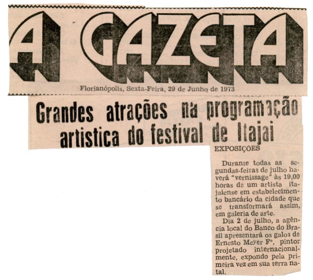 MF.02316.2 Recorte de 29/06/1973 com destaque para matéria "Grandes atrações na programação artística do festival de Itajaí e exposição no Banco do Brasil (16,1 x 14,4 cm).