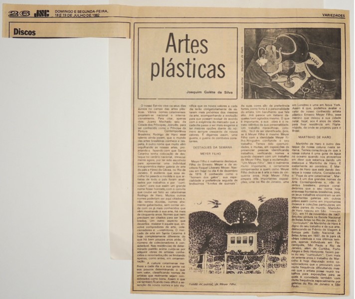 MF.02336.1 Página de jornal, aderida a uma folha sulfite, de 18/07 e 19/07/1982, Caderno de Variedades, coluna de Artes Plásticas assinada por Joaquim Galéte da Silva com destaque para matéria intitulada Destaques da Semana Meyer Filho. Possui fotografia de obra. (35,2 x 29,1 cm).