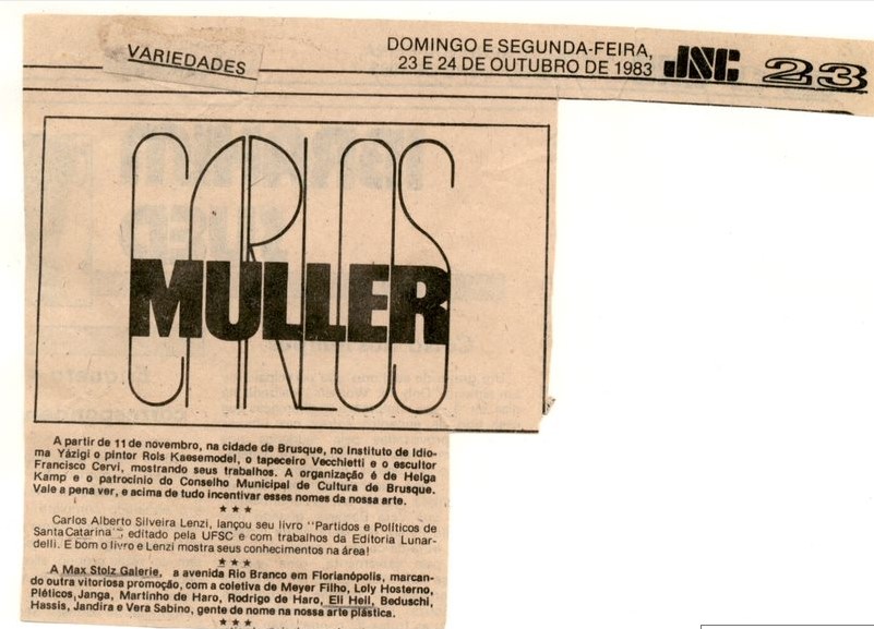 MF.02337.5 Recorte de jornal de 23/10 e 24/10/1983, aderido a folha sulfite, caderno de Variedades, da coluna "Carlos Muller" sobre exposição na Max Stoltz Galerie (18,1 x 13,3 cm).