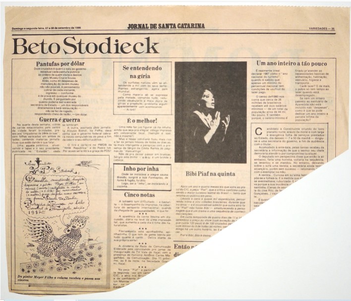MF.02339.2 Página de jornal, de 07/09 e 08/09/1986, Caderno de Variedades, Coluna Beto Stodieck, com destaque para obra feita por Meyer Filho ao jornalista Beto Stodieck. Possui fotografia de obra. (36,1 x 30,9).