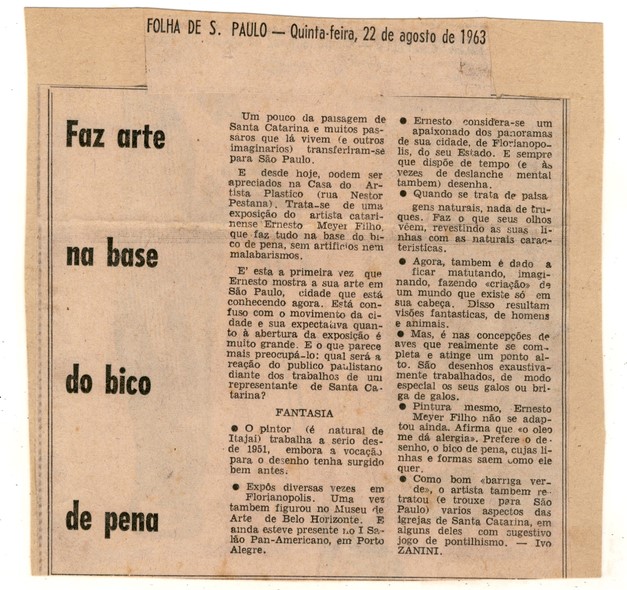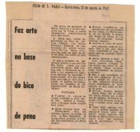 MF.02343.1 Recorte de jornal, aderido a uma folha sulfite, de 22/08/1963 com destaque para matéria com autoria de Ivo Zanini, intitulada "Faz arte na base do bico". (15,2 x 14,8 cm)