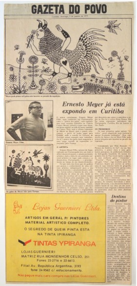 MF.02350.4: Recorte de jornal de 08/01/1975 com matéria intitulada “Ernesto Meyer já está expondo em Curitiba” e apresentando foto de obra e do artista (22,7 x 49,9 cm)
