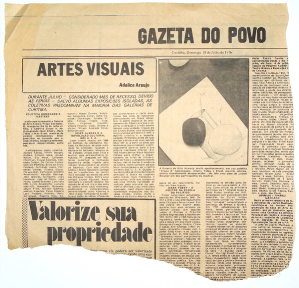 Coleção Coleção Instituto Meyer Filho Item MF.02351 11/11/2022 por Ana Julia Patricio   Documento MF.02351 Baixar Metadados Miniatura Nº de registroMF.02351Localização no InstitutoMAPOTECA 1 - GAV. 8 - PASTA 13ColeçãoIII. PeriódicosTipoJornalTítuloGazeta do Povo (PR) 1976AutoriaNILocal*Curitiba (PR) | São Paulo (SP)Data Década 1970 Ano 1976 DescriçãoRecorte de jornal de 18/06/1976 da coluna “Artes Visuais” com autoria de Adalice Araújo, com matéria intitulada “Coletiva homenageia mestres”. Apresenta foto do artista com suas obras. (25,6 x 41,3 cm)IndexadoresAdalice Araújo | Gazeta do Povo | JornalDimensão28,3 x 27,1 cmSuportePapel jornalTécnicaImpressão sobre papel jornalBordaNão se aplicaColorNão se aplicaEstado de conservaçãoBomDanos causados porAmarelecimento | Manchas | Sujidades | Vincos e dobrasProcedimentosAcondicionado | Digitalizado | HigienizadoForma de aquisiçãoLicença de uso de direitos autorais gratuitaProcedência*Família Meyer FilhoData de aquisição Data NI Registrado porAna Julia Vieira PatrícioData de registro11/11/2022Condições de ReproduçãoTodos os direitos reservados. Para utilização da imagem solicitar autorização ao Instituto Meyer Filho. Continue navegando MF.02350 MF.02352 Voltar para a página de itens