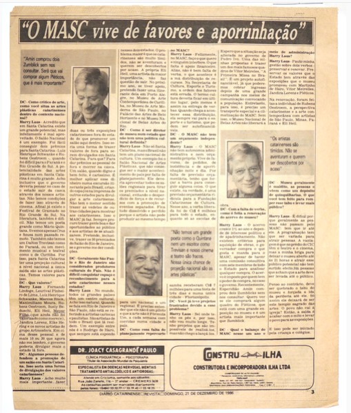 MF.02360.1 Recorte de jornal de 21/12/1986, aderido a uma folha sulfite com destaque para matéria intitulada "O MASC vive de favores e aporrinhação" com entrevista com Harry Laus. (30 x 36,7 cm)