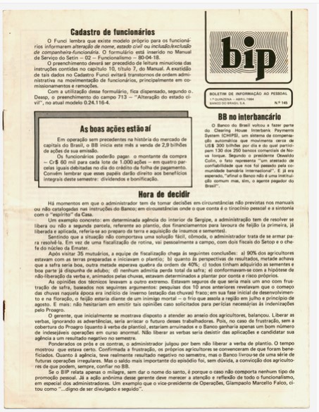 Boletim do Banco do Brasil, contendo 8 páginas, tendo a matéria em destaque na página 8 com título "Galo na cabeça" de autoria de Carmelo Mário Faraco e fotografia de obra do artista. Possui outro exemplar MF.02506.1.