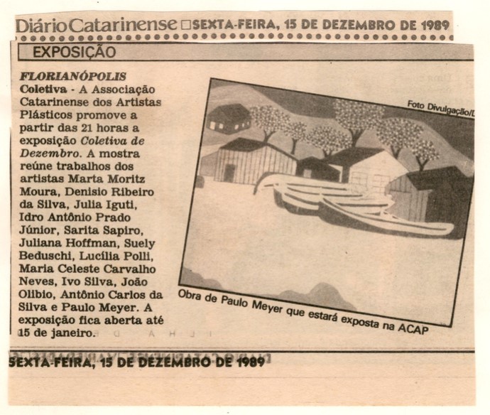 MF.02363.2 Recorte de jornal de 15/12/1989, aderido a uma folha sulfite com destaque para matéria intitulada "Florianópolis Coletiva". Apresenta reprodução de obra de Paulo Meyer. (13,8 x 11,9 cm)