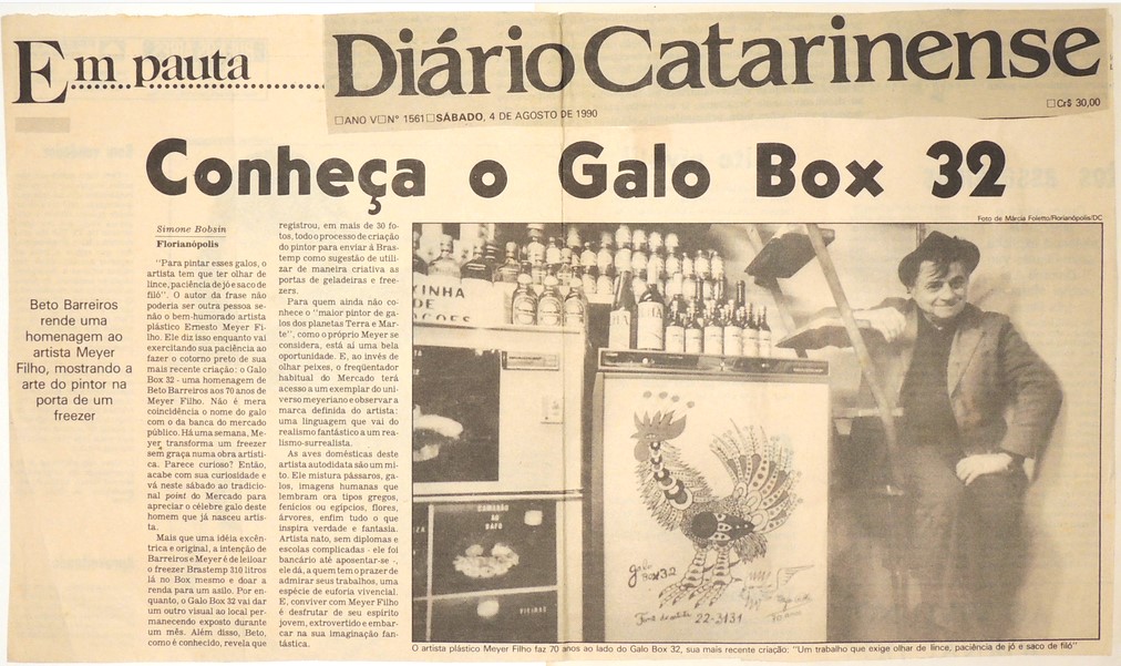 MF.02364.1 Recorte de 04/08/1990 da coluna "Em pauta" com matéria intitulada "Conheça o Galo Box 32). Possui reprodução de fotografia de Meyer Filho (38 x 22,4 cm).