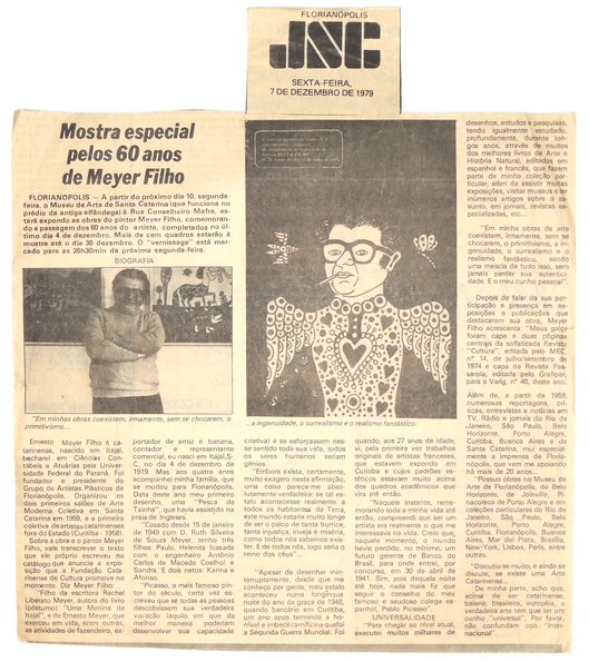 MF.02333.1 Recorte de jornal de 07/12/1979 com destaque para matéria intitulada "Mostra especial pelos 60 anos de Meyer Filho". Apresenta fotografia de obra e do artista (23,9 x 27,2 cm). Possui fotocópia MF.02333.1.1 (21,5 x 32,8 cm)