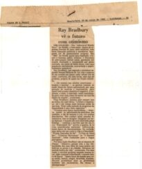 MF.02453.3: Recorte de jornal, aderido a uma folha sulfite ,de 23/03/1983 com destaque para matéria intitulada "Ray Bradbury vê o futuro com otimismo" (20,6 x 24,4 cm)